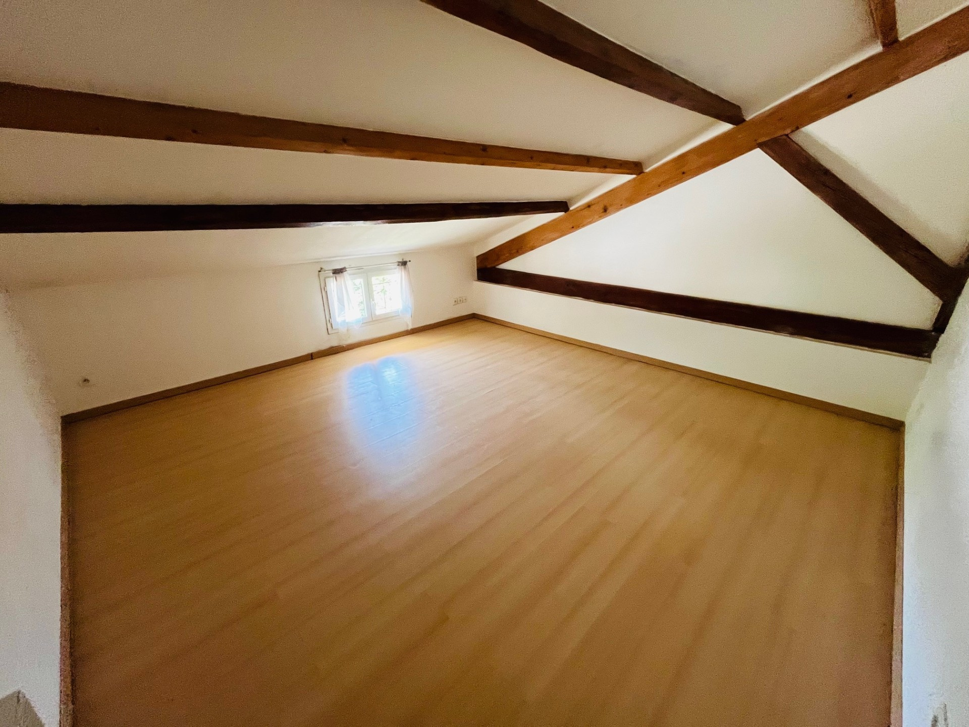 Développée sur deux niveaux, la maison offre environ 75 m² Loi Carrez (chambres mansardées) et près de 100 m² de surface au sol.