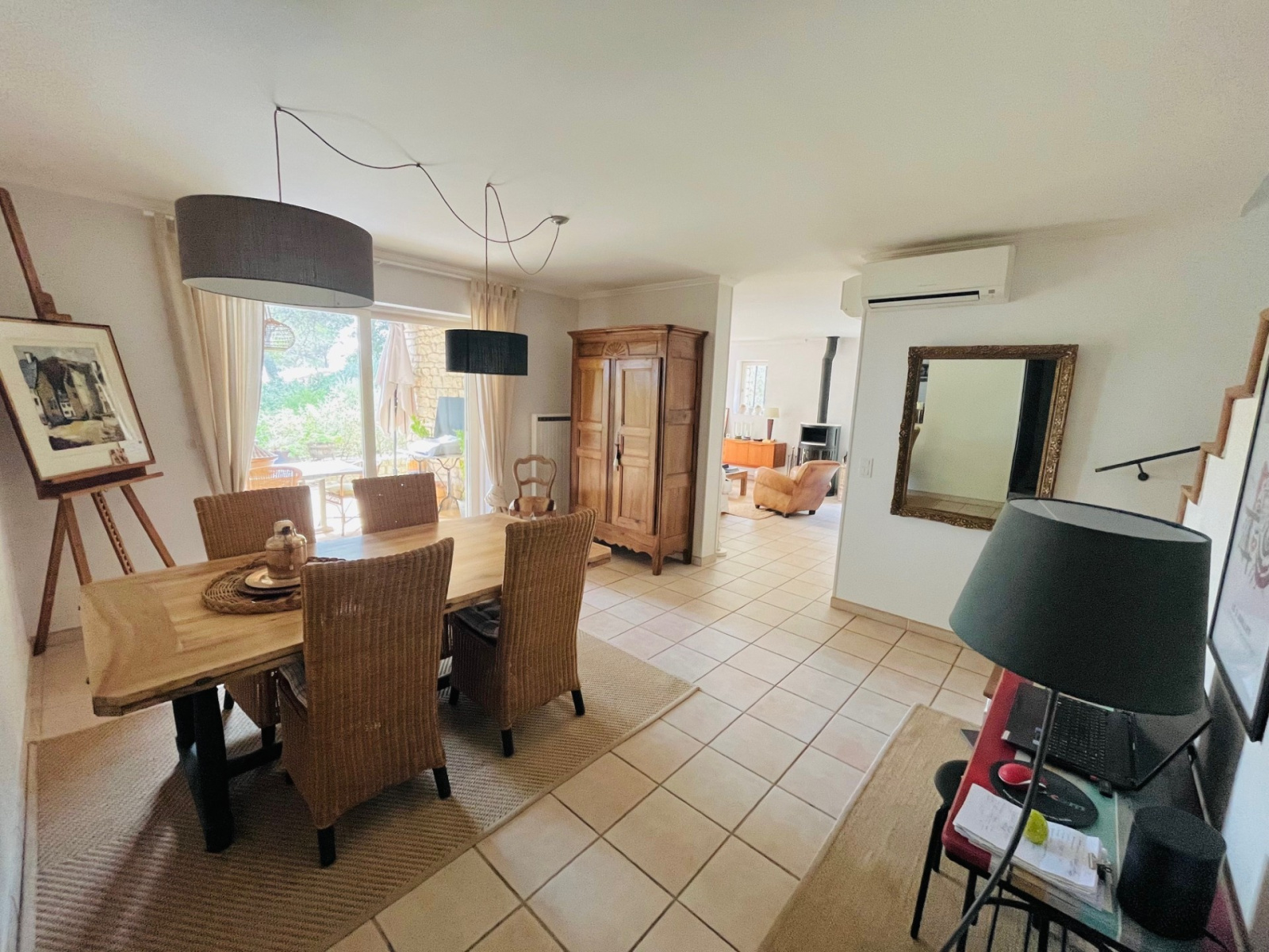 Dès l’entrée, vous serez accueillis par un vaste hall desservant un grand vestiaire, une buanderie/cellier, ainsi qu’un lumineux salon de 28 m² avec poêle à bois, séparé par une élégante verrière en fer forgé. Ce salon s’ouvre largement sur l’extérieur et communique avec une salle à manger de 22 m² et une cuisine indépendante de 14 m², elles aussi séparées par une verrière, offrant ainsi une belle unité visuelle et une circulation fluide entre les espaces de vie. Le tout s’ouvre sur une spacieuse terrasse dallée, idéale pour profiter du cadre verdoyant.