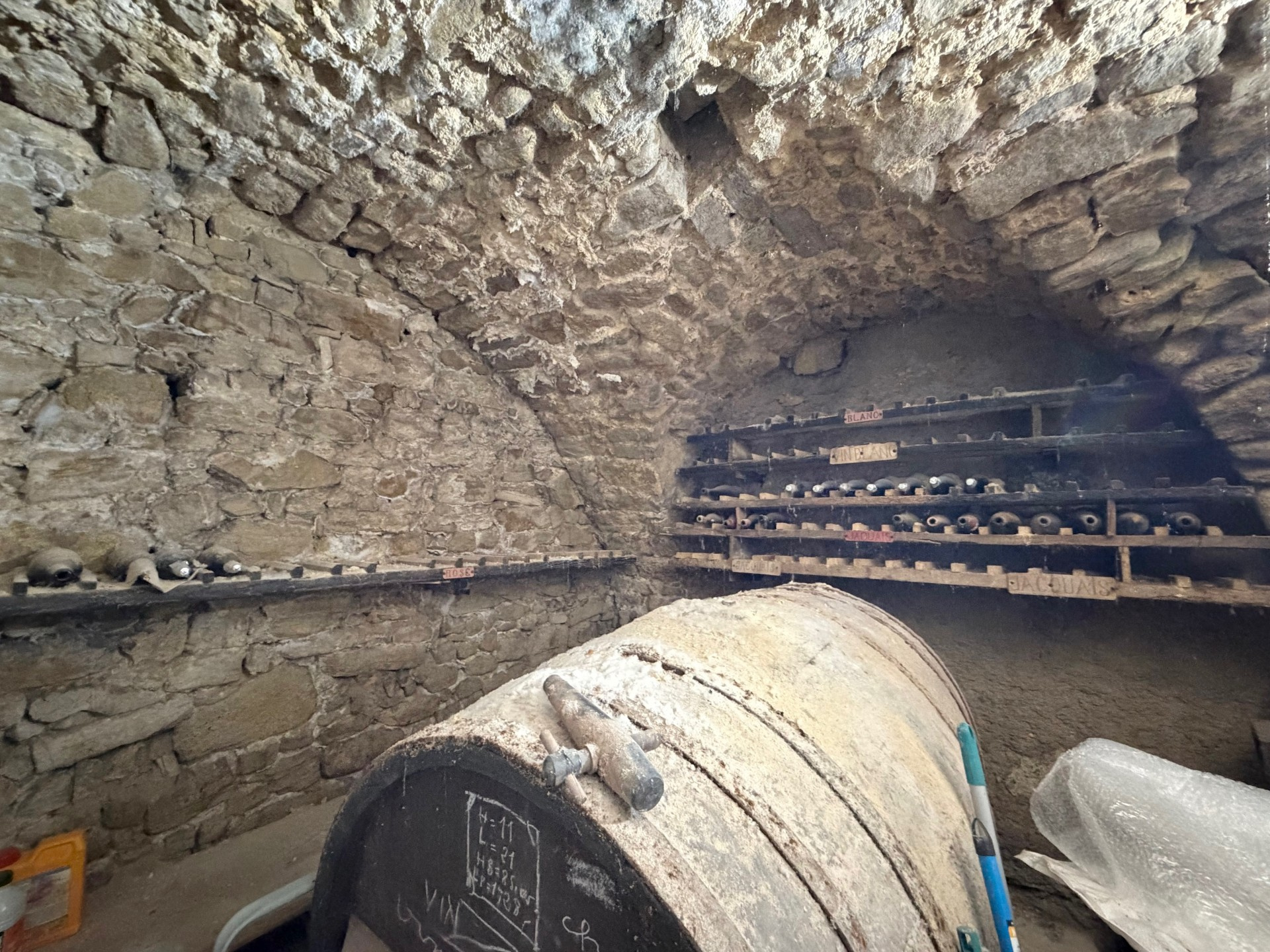 D’une surface habitable d’environ 90 m², elle se compose d’une cuisine équipée avec espace repas, ouvrant sur une superbe cave voûtée, idéale pour la conservation de vos meilleures bouteilles. Le séjour lumineux, agrémenté d’un poêle à bois, offre une vue dégagée particulièrement agréable.